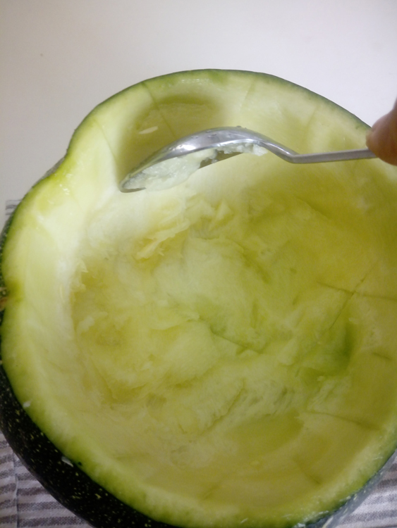 Mettete da parte la polpa tagliata a dadini e immergete la zucchina svuotata in abbondante acqua bollente leggermente salata fino a quando non si ammorbidirà (circa 5 minuti).